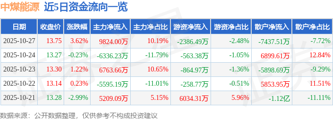 证券之星消息,截至2025年10月27日收盘,中煤能源(601898)报收于13.75元,上涨3.62%,换手率0.77%,成交量70.76万手,成交额9.64亿元。