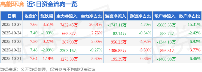 证券之星消息,截至2025年10月27日收盘,高能环境(603588)报收于7.66元,上涨3.51%,换手率3.18%,成交量48.47万手,成交额3.71亿元。