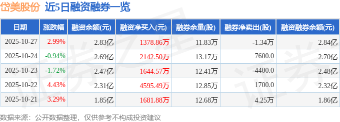 岱美股份融资融券信息显示,融资方面,当日融资买入4228.4万元,融资偿还2849.54万元,融资净买入1378.86万元,连续3日净买入累计5165.92万元。融券方面,融券卖出100.0股,融券偿还1.35万股,融券余量11.83万股,融券余额89.53万元。融资融券余额2.84亿元。