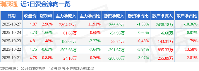 证券之星消息,截至2025年10月27日收盘,瑞茂通(600180)报收于4.87元,上涨2.96%,换手率4.47%,成交量48.55万手,成交额2.35亿元。