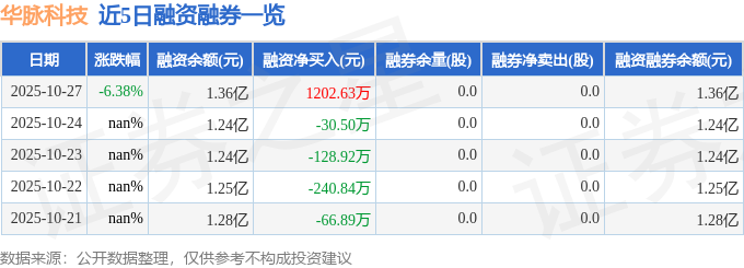 华脉科技融资融券信息显示,融资方面,当日融资买入2538.92万元,融资偿还1336.29万元,融资净买入1202.63万元。融券方面,融券卖出0.0股,融券偿还0.0股,融券余量0.0股,融券余额0.0万元。融资融券余额1.36亿元。