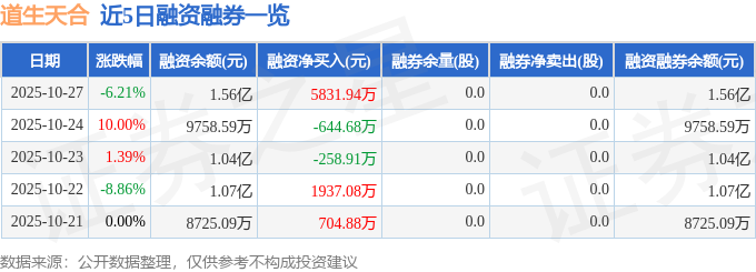 道生天合融资融券信息显示,融资方面,当日融资买入1.37亿元,融资偿还7871.29万元,融资净买入5831.94万元。融券方面,融券卖出0.0股,融券偿还0.0股,融券余量0.0股,融券余额0.0万元。融资融券余额1.56亿元。