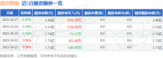 武汉控股融资融券信息显示,融资方面,当日融资买入8161.8万元,融资偿还4568.9万元,融资净买入3592.9万元。融券方面,融券卖出0.0股,融券偿还0.0股,融券余量0.0股,融券余额0.0万元。融资融券余额2.48亿元。