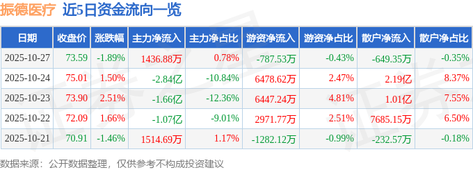 证券之星消息,截至2025年10月27日收盘,振德医疗(603301)报收于73.59元,下跌1.89%,换手率9.57%,成交量25.49万手,成交额18.44亿元。