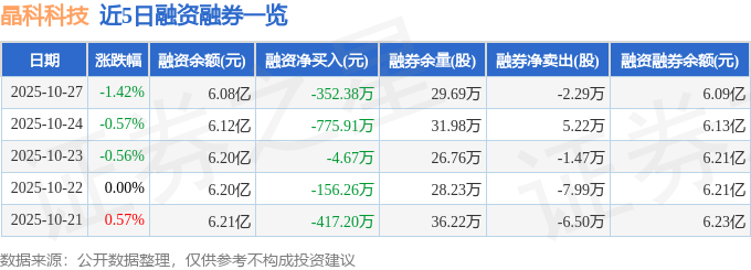 晶科科技融资融券信息显示,融资方面,当日融资买入2850.9万元,融资偿还3203.29万元,融资净偿还352.38万元。融券方面,融券卖出1300.0股,融券偿还2.42万股,融券余量29.69万股,融券余额102.73万元。融资融券余额6.09亿元。
