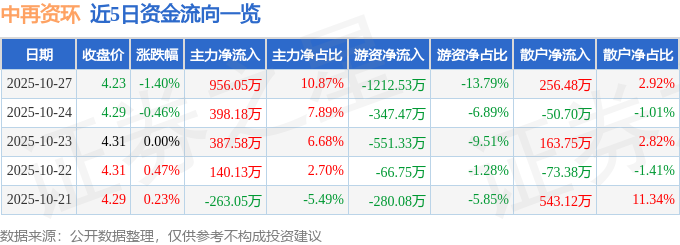 证券之星消息,截至2025年10月27日收盘,中再资环(600217)报收于4.23元,下跌1.4%,换手率1.24%,成交量20.62万手,成交额8792.48万元。