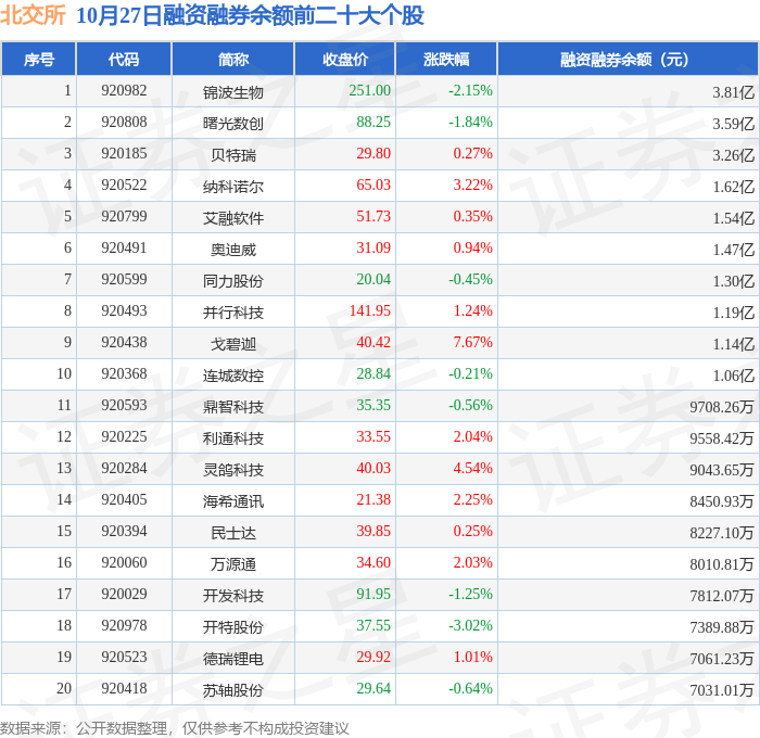北交所融资融券余额前三分别为:锦波生物(920982)融资融券余额3.81亿元、曙光数创(920808)融资融券余额3.59亿元、贝特瑞(920185)融资融券余额3.26亿元,前20具体见下表: