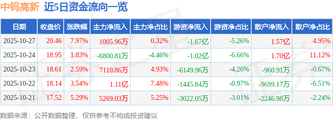 证券之星消息,截至2025年10月27日收盘,中钨高新(000657)报收于20.46元,上涨7.97%,换手率10.76%,成交量155.48万手,成交额31.77亿元。