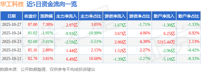 证券之星消息,截至2025年10月27日收盘,华工科技(000988)报收于87.0元,上涨7.38%,换手率11.32%,成交量113.73万手,成交额97.4亿元。