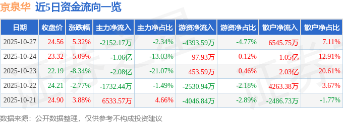 证券之星消息,截至2025年10月27日收盘,京泉华(002885)报收于24.56元,上涨5.32%,换手率16.03%,成交量37.02万手,成交额9.21亿元。