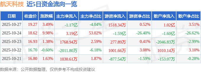 证券之星消息,截至2025年10月27日收盘,航天科技(000901)报收于19.27元,上涨3.49%,换手率18.85%,成交量150.43万手,成交额28.94亿元。