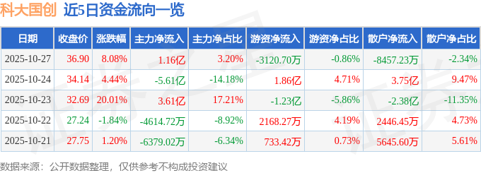 证券之星消息,截至2025年10月27日收盘,科大国创(300520)报收于36.9元,上涨8.08%,换手率35.9%,成交量99.8万手,成交额36.22亿元。