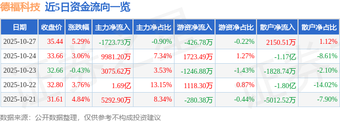 证券之星消息,截至2025年10月27日收盘,德福科技(301511)报收于35.44元,上涨5.29%,换手率14.42%,成交量54.03万手,成交额19.2亿元。