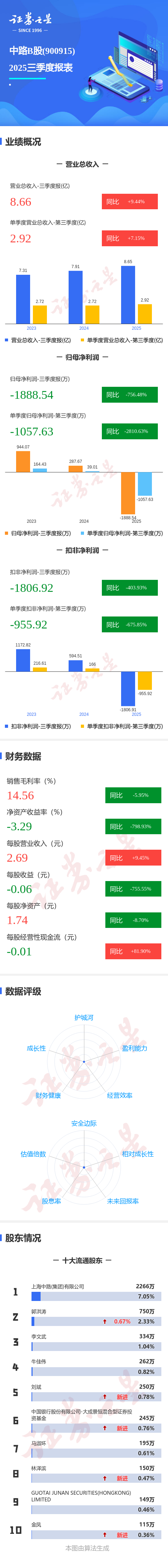 证券之星消息,中路B股2025年三季报显示,公司主营收入8.66亿元,同比上升9.45%;归母净利润-1888.54万元,同比下降756.49%;扣非净利润-1806.92万元,同比下降403.93%;其中2025年第三季度,公司单季度主营收入2.92亿元,同比上升7.15%;单季度归母净利润-1057.63万元,同比下降2810.64%;单季度扣非净利润-955.92万元,同比下降675.86%;负债率52.12%,投资收益-43.15万元,财务费用257.36万元,毛利率14.56%。