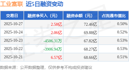 证券之星消息,10月27日,工业富联(601138)融资买入20.9亿元,融资偿还18.32亿元,融资净买入2.58亿元,融资余额72.46亿元,当日融资净买入排名第23。