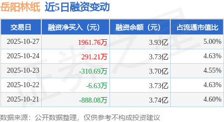 证券之星消息,10月27日,岳阳林纸(600963)融资买入3111.19万元,融资偿还1149.43万元,融资净买入1961.76万元,融资余额3.93亿元。