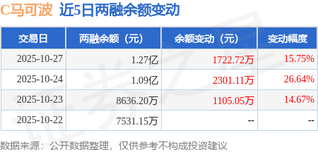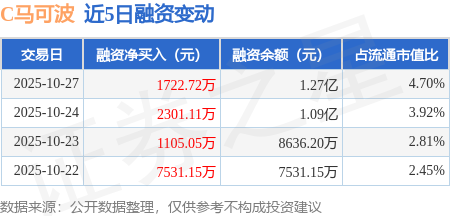证券之星消息,10月27日,C马可波(001386)融资买入6339.02万元,融资偿还4616.3万元,融资净买入1722.72万元,融资余额1.27亿元,近3个交易日已连续净买入累计5128.88万元。
