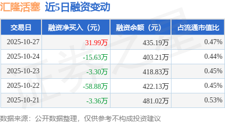 证券之星消息,10月27日,汇隆活塞(920455)融资买入53.77万元,融资偿还21.78万元,融资净买入31.99万元,融资余额435.19万元。