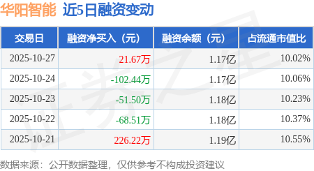 证券之星消息,10月27日,华阳智能(301502)融资买入451.86万元,融资偿还430.18万元,融资净买入21.67万元,融资余额1.17亿元。