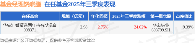 证券之星消息,截止2025年三季度末,基金经理饶晓鹏管理的华安汇智精选两年持有期混合(008371)季度净值涨24.02%。