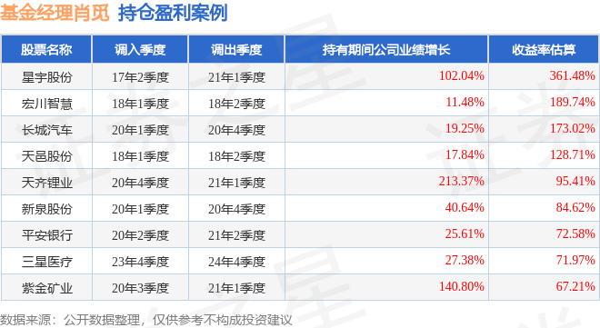 肖觅管理的嘉实物流产业股票A基金在17年2季度买入星宇股份,在持有3年又3个季度后在21年1季度卖出。持有期间的估算收益率为361.48%,持有期间星宇股份在2017年到2021年的年报归属净利润增幅达102.04%。
