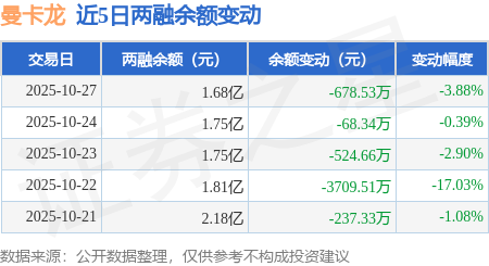证券之星消息,10月27日,曼卡龙(300945)融资买入1972.07万元,融资偿还2650.6万元,融资净卖出678.53万元,融资余额1.68亿元。
