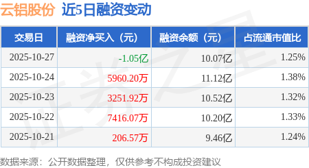 证券之星消息,10月27日,云铝股份(000807)融资买入2.54亿元,融资偿还3.59亿元,融资净卖出1.05亿元,融资余额10.07亿元,近20个交易日中有14个交易日出现融资净买入。