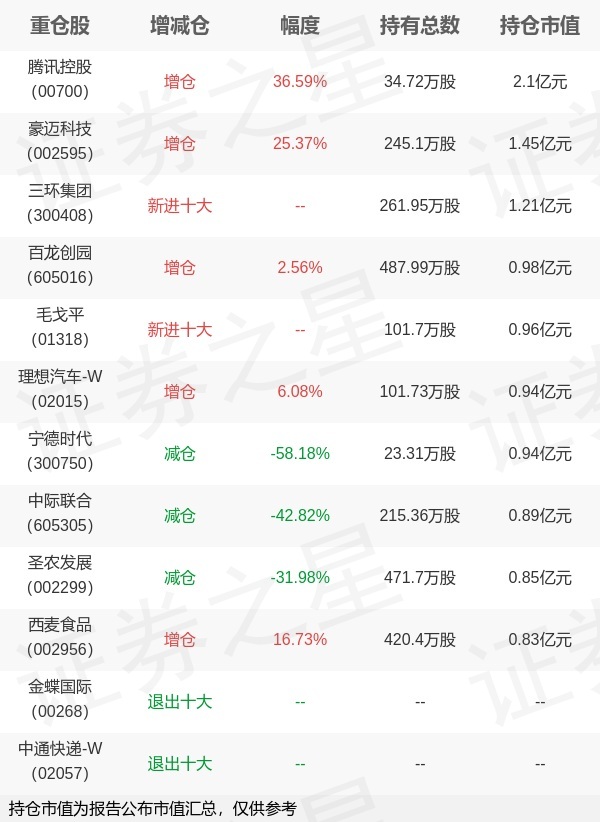 证券之星消息,10月28日博道基金孙文龙旗下基金公布2025年三季报,综合其旗下各基金报告,港股持仓比重大幅增加,腾讯控股、理想汽车-W等被增持,毛戈平等新入十大重仓;另外,食品行业板块个股更受其关注,与上季度相比,百龙创园、西麦食品等被增持;养鸡行业板块则遭到减持,圣农发展等被减持;目前其旗下基金综合持仓排名前三个股为腾讯控股、豪迈科技、三环集团。