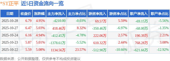 证券之星消息,截至2025年10月28日收盘,*ST正平(603843)报收于6.79元,上涨4.95%,换手率0.26%,成交量1.83万手,成交额1243.71万元。