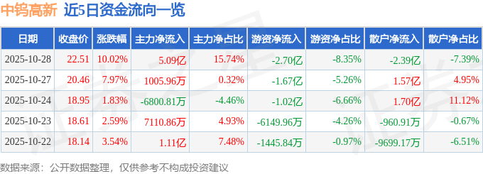 证券之星消息,中钨高新10月28日涨停收盘,收盘价22.51元。该股于9点59分涨停,2次打开涨停,截止收盘封单资金为1.38亿元,占其流通市值0.42%。