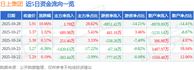 证券之星消息,日上集团10月28日涨停收盘,收盘价5.91元。该股于9点33分涨停,1次打开涨停,截止收盘封单资金为5176.86万元,占其流通市值1.57%。