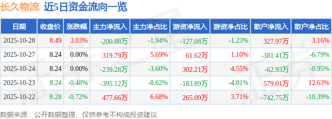 证券之星消息,截至2025年10月28日收盘,长久物流(603569)报收于8.49元,上涨3.03%,换手率2.04%,成交量12.28万手,成交额1.04亿元。