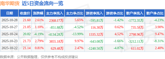证券之星消息,截至2025年10月28日收盘,南华期货(603093)报收于21.6元,上涨2.61%,换手率3.17%,成交量19.33万手,成交额4.19亿元。