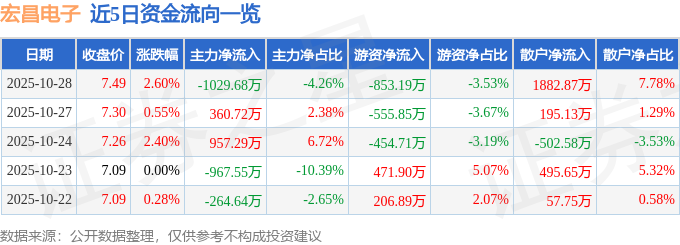 证券之星消息,截至2025年10月28日收盘,宏昌电子(603002)报收于7.49元,上涨2.6%,换手率2.86%,成交量32.45万手,成交额2.42亿元。