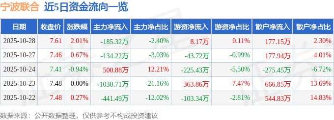 证券之星消息,截至2025年10月28日收盘,宁波联合(600051)报收于7.61元,上涨2.01%,换手率3.26%,成交量10.12万手,成交额7711.04万元。