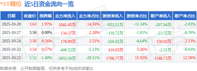 证券之星消息,截至2025年10月28日收盘,*ST精伦(600355)报收于3.63元,上涨1.97%,换手率4.15%,成交量20.42万手,成交额7352.6万元。