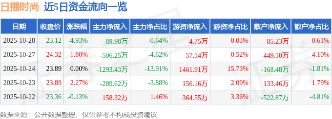 证券之星消息,截至2025年10月28日收盘,日播时尚(603196)报收于23.12元,下跌4.93%,换手率2.54%,成交量6.03万手,成交额1.41亿元。