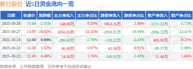 证券之星消息,截至2025年10月28日收盘,新日股份(603787)报收于13.6元,下跌2.51%,换手率13.67%,成交量31.47万手,成交额4.44亿元。