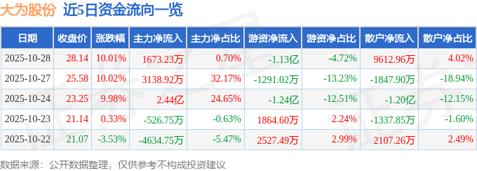 证券之星消息,截至2025年10月28日收盘,大为股份(002213)报收于28.14元,上涨10.01%,已连续涨停3天,换手率41.49%,成交量85.75万手,成交额23.93亿元。