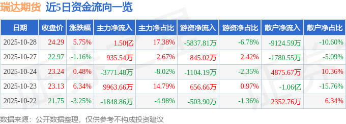 证券之星消息,截至2025年10月28日收盘,瑞达期货(002961)报收于24.29元,上涨5.75%,换手率7.96%,成交量35.43万手,成交额8.61亿元。