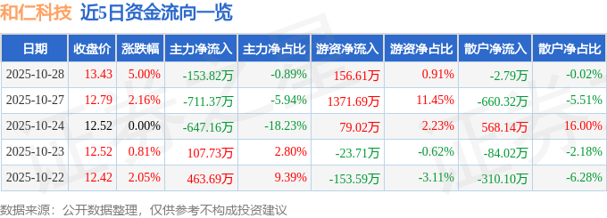 证券之星消息,截至2025年10月28日收盘,和仁科技(300550)报收于13.43元,上涨5.0%,换手率4.96%,成交量13.02万手,成交额1.73亿元。