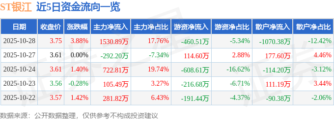 证券之星消息,截至2025年10月28日收盘,ST银江(300020)报收于3.75元,上涨3.88%,换手率3.03%,成交量23.21万手,成交额8620.25万元。