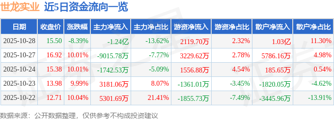 证券之星消息,截至2025年10月28日收盘,世龙实业(002748)报收于15.5元,下跌8.39%,换手率24.1%,成交量57.84万手,成交额9.13亿元。