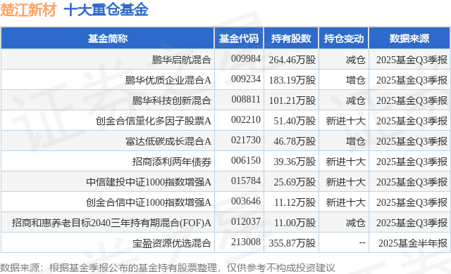 根据2025基金Q3季报公募基金重仓股数据,重仓该股的公募基金共9家,其中持有数量最多的公募基金为鹏华基金的鹏华启航混合。鹏华启航混合目前规模为6.62亿元,最新净值1.0119(10月27日),较上一交易日上涨1.06%,近一年上涨29.61%。该公募基金现任基金经理为柳黎。柳黎在任的基金产品包括:鹏华科技创新混合,管理时间为2020年8月29日至今,期间收益率为32.42%;鹏华优质企业混合A,管理时间为2022年11月12日至今,期间收益率为-12.89%。