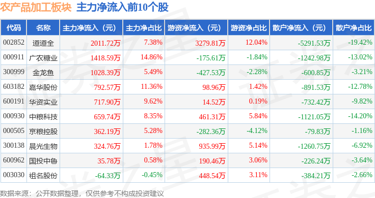 从资金流向上来看,当日农产品加工板块主力资金净流出1.08亿元,游资资金净流入9570.82万元,散户资金净流入1275.74万元。农产品加工板块个股资金流向见下表: