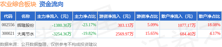 从资金流向上来看,当日农业综合板块主力资金净流出4634.66万元,游资资金净流入2873.09万元,散户资金净流入1761.57万元。农业综合板块个股资金流向见下表: