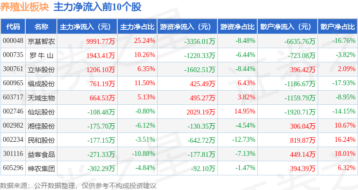 从资金流向上来看,当日养殖业板块主力资金净流出1.07亿元,游资资金净流入1.6亿元,散户资金净流出5362.3万元。养殖业板块个股资金流向见下表: