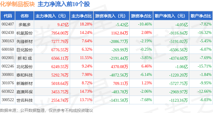 从资金流向上来看,当日化学制品板块主力资金净流入2.29亿元,游资资金净流出5.23亿元,散户资金净流入2.94亿元。化学制品板块个股资金流向见下表:
