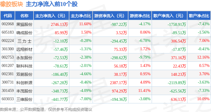 从资金流向上来看,当日橡胶板块主力资金净流出5779.31万元,游资资金净流入2114.65万元,散户资金净流入3664.66万元。橡胶板块个股资金流向见下表: