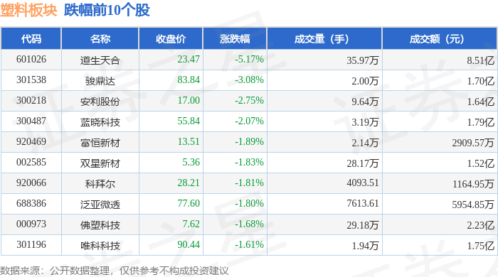 证券之星消息,10月28日塑料板块较上一交易日上涨1.24%,东材科技领涨。当日上证指数报收于3988.22,下跌0.22%。深证成指报收于13430.1,下跌0.44%。塑料板块个股涨跌见下表: